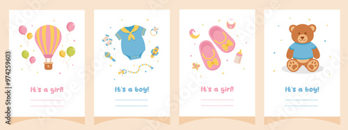 Baby shower set of cards, posters, invitations. It's a boy. It's a girl. Template for party invitations, posters, greeting cards, social media.