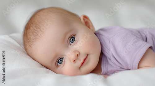 baby, blue, eye, white, blanket, indoor, soft, lighting, infant, children, home, facial, expression, resting, peaceful, smiling, clothing, gear, portrait, age, cuteness, childhood, playful, warm, skin, hair, joy, gaze, adorable, hand, comfort, cosy, calm, relaxing, eye, contact, happiness, family, love, innocence, development, growth, nurturing, parenthood, moment, personality, warmth, tenderness, emotion