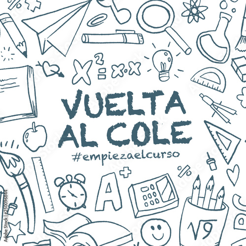 Back to school banner. "Back to school, the class begins" written in Spanish. Vector pattern with school elements