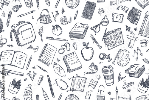 Back to School Doodle Seamless Pattern with Hand Drawn School Supplies Vector