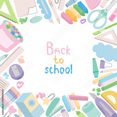 school, frame, copy space, back to school, stationery, flat, vector, marker, chalk, round, scissors, notebook, supply, illustration, design, study, children, education, colourful, graphic, concept, template, art, cute, book, student, element, ruler, back, background, crayons, banner, learning