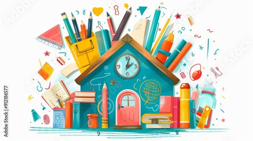 Back to School: Fun and Colorful Learning House Illustration - A vibrant illustration showcasing a schoolhouse bursting with colorful learning supplies, representing knowledge, creativity, and the joy