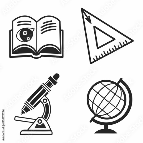 back to school, education, icon, book, globe, microscope, ruler, learning, cognition, science, study, school supplies, classroom, textbook, geography, research, tool, equipment, vector, illustration, graphic, design, symbol, simple, black-and-white, flat, minimalist
