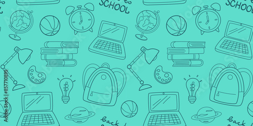 back to school, trendy, seamless pattern, doodle, design, pattern, school supplies, simple, flat, style, hand-drawn, education, science, homework, icon, element, concept, symbol, craft, backpack, table lamp, book, laptop, idea, palette, alarmclock, planet, elementary, bag, background, chalk, chemistry, creative, computer
