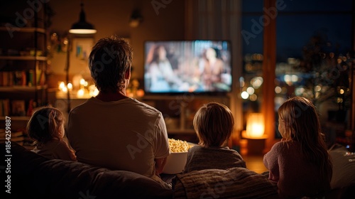 back view four family members sit on couch watching movie at home in evening. room is dimly lit with cozy lights creating a warm atmosphere. Popcorn is shared among them