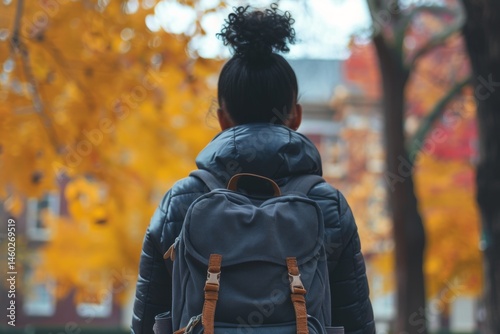 Back view of a black female student with backpack standing on college campus at fall