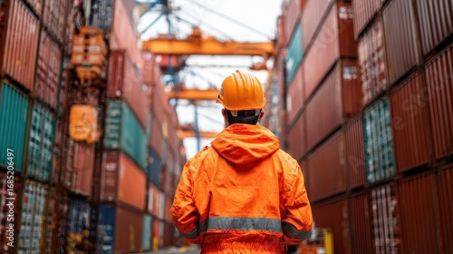 Back view of a logistics coordinator ensuring stock container in a brightly port