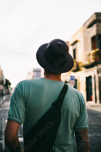 adventure, alone, arm, back, bright, building, caucasian, city, cool, day, exterior, fashion, hat, hipster, holiday, leisure, lifestyle, male, man, modern, outside, people, person, portrait, retro, sidewalk, single, street, style, summer, t-shirt, tattoo, tour tourism, holiday maker, travel, urban, vacation, view, walk, young, white, adult, adult, 20s, grown-up