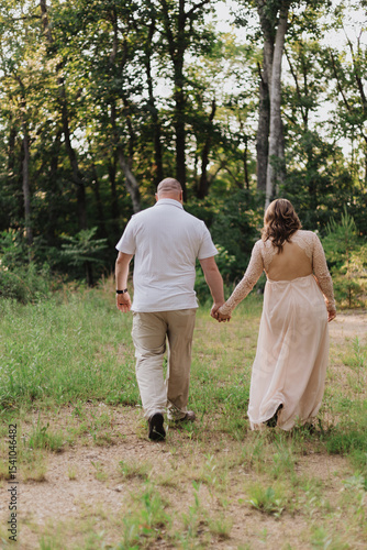 Back view of couple walking hand in hand along grassy forest path, woman in long lace-back pink dress and man in white polo with khaki pants under warm afternoon light