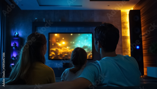 family, watching, television, evening, night, cosy, cinema, motion picture, sofa, together, people, person, mother, father, children, children, children, son, daughter, television, living room, relaxation, man, woman, enjoyment, smiling, back, view, silhouette, watching tv, bonding, togetherness, indoor, female, male, sitting, film, girl, boy, motion picture, cosy, couch, comfortable, happy, home, modern