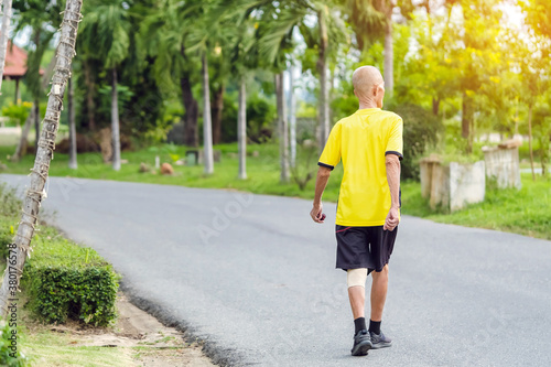 Back view portrait of a Asian elderly man in fitness wear walking and jogging for good health in public park. Senior jogger in nature. Older Man enjoying Peaceful nature. Healthcare concept.