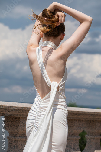 Back view, portrait of a young beautiful woman in a long white dress