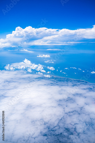 Background blue sky and white clouds seen from plane window. There is space for writing content. Natural sky, bright style.