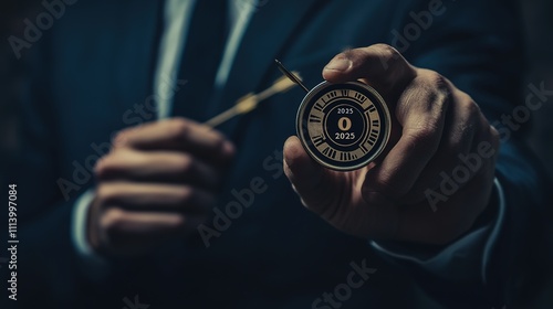 Background Featuring a Businessman Holding the Text "2025" with an Arrow Targeting Goals, Where the "0" in "2025" is Replaced by an Arrow Hitting the Bullseye, Symbolizing the Implementation of Busine