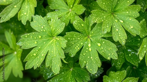 background image of close-up green leaves with fresh dewdrops, showcasing the beauty of nature, realistic style, soft lighting, fresh and calming atmosphere