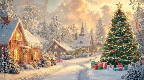 background is a winterwonderland with a christmas tree with presents, setting with light, warm and bright tones, designed in a style that is perfect for a children's book. high definition