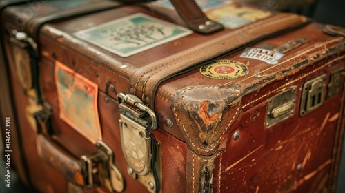 Background of a retro suitcase with travel stickers and scuffed corners.