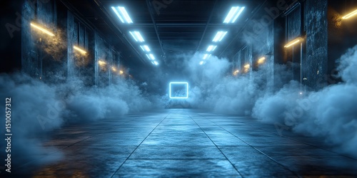 Background of an empty disco scene. Neon square figure in the center of the scene. Neon light smoke.