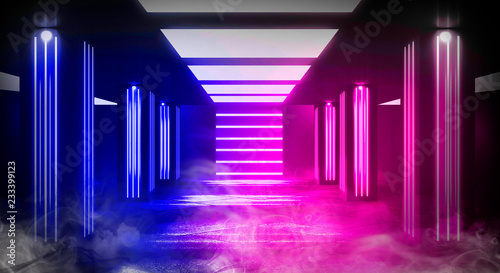 Background of an empty room with walls and concrete floor. Empty room, smoke, smog, neon lights, lanterns.