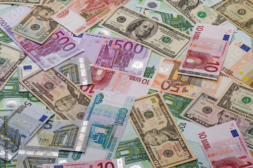 Background of dollars, euros and rubles