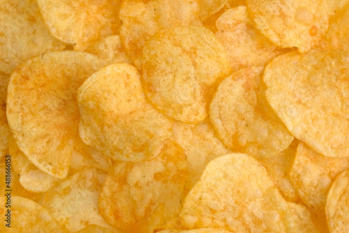 Background of Potato chips close up. Nutrition concept. Top view, copy space.