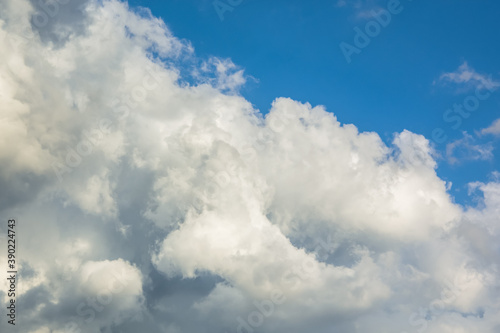 Background of white Cumulus clouds in a blue sky. The concept of weather and rain. Pre-storm state of nature. The natural background. Full frame with copy space
