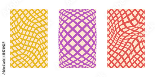 Background set Groovy hippie 70s. Grid line, swirl, twirl pattern. Grid Twisted and distorted vector background texture, trendy retro psychedelic style. Y2k aesthetic background.
