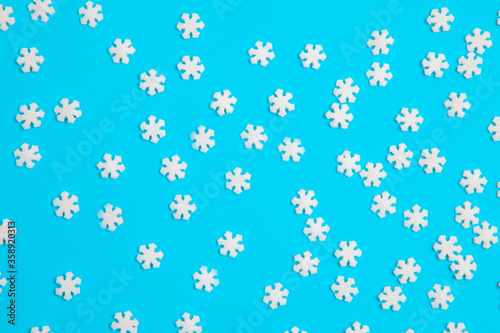 background, sweet topping for a cake in the shape of a snowflake on a blue background