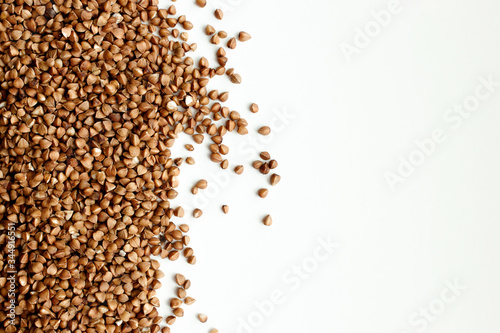 Background, texture-buckwheat on a white background. The concept of healthy, proper nutrition, vegetarianism.