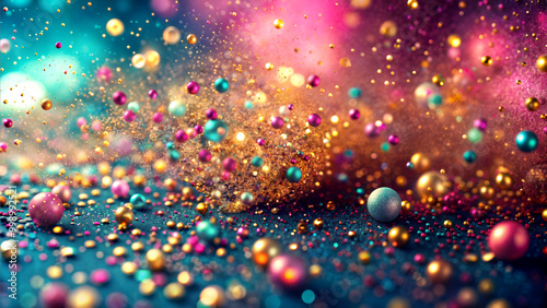 background with bubbles, colorful gold, pink, blue, green particles in mid-air against a blurred abstract background, festive atmosphere, New Year's, Diwali, Christmas