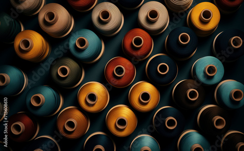 Background with many colorful thread spools.Minimal fashion creative concept.Flat lay,top view..Generative AI