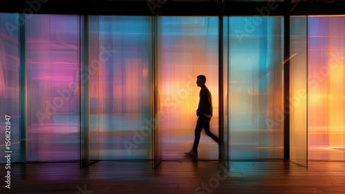Backlit Image of a Young Man Walking Past Vibrantly Colored Glass Panels in an Urban Setting