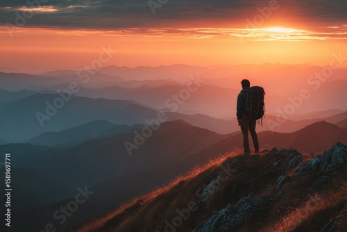 Backpacker atop a mountain at sunset embodying a healthy active lifestyle