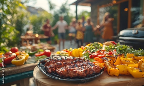 Backyard Dinner Table with Tasty Grilled Barbecue Meat, Fresh Vegetables and Salads. Happy Joyful People Dancing to Music, Celebrating and Having Fun in the Background on House