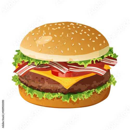 burger, fast food, bacon, cheese, lettuce, tomatoes, sandwich, food, meal, cheeseburger, tasty, lunch, comfort food, cartoon, vector, hamburger, snack