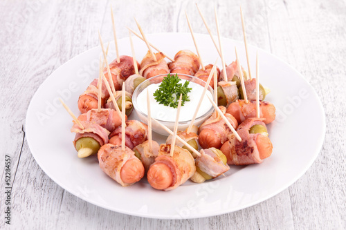 snack, finger food, bacon, wrapped, rolled, sausage, olive, almond, cooked, cookery, buffet, food, sauce, widener, dip, meat, meal, culinary, gastronomy, celebration, caterer, catering, cocktail, wood, background, diet, nourishment, receipe