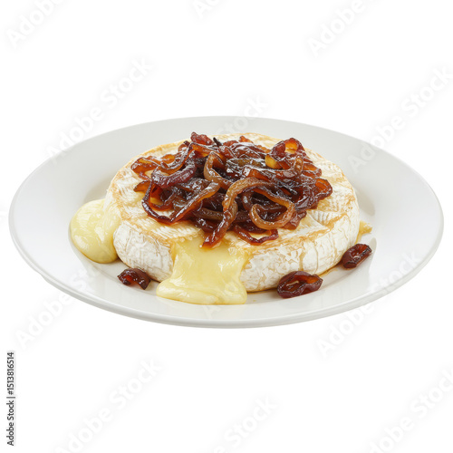 Baked cheese topped with caramelized onions and dried fruits on a white plate