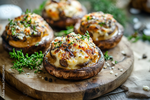 Baked stuffed mushroom champignons with cheese and herbs, on a plate, on a wooden board