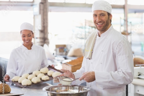 man, male, caucasian, young adult, woman, female, bakery, food and drink, industry, store, eatery, business, industrial, kitchen, hotel, uniform, chef, job, profession, professional, standing, occupation, staff, baker, counter, worktop, bowl, mixing bowl, flour, sieve, working, making, happy, smiling, cheerful, team, colleague, co-worker, portrait, indoor