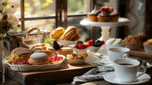 Bakery Breakfast Spread Featuring Fresh Pastries, Bread, Fruit Tarts, and Gourmet Coffee for Promotional Design