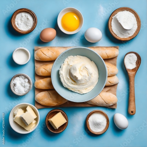 bake, top, food, bakery, kitchen, flour, cake, egg, utensil, pastry, butter, sugar, ingredient, dough, pie, culinary, home, background, blue, generative, ai