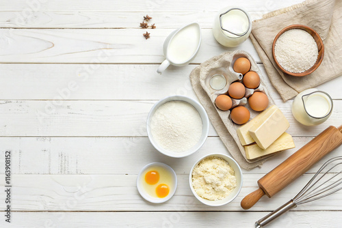 Baking background. Ingredients for the dough - Milk, eggs, flour, sour cream, butter, salt and different tools. On a white wooden background. Free space for text. Top view
