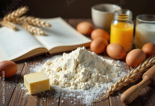 baking, ingredient, flour, egg, butter, milk, cookbook, open book, rolling pin, wheat, cooking, kitchen, homemade, fresh, raw, food, culinary, preparation, rustic, wooden table, natural light, still life, comfort food, dessert, bread, pastry, traditional, wholesome, healthy, organic, measuring, mixing, cookbook, pumpkin, cosy, autumn