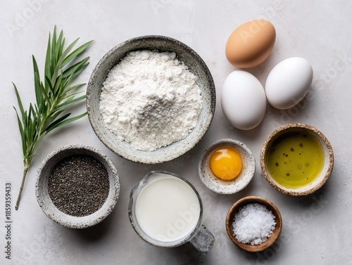 baking, ingredient, flour, egg, milk, herb, food, cooking, kitchen, preparation, olive oil, salt, fresh, organic, natural, rustic, overhead, neutral, receipe, egg yolk, clean, minimal, white background, soft, homemade, dairy, simple, wooden bowl, healthy, breakfast, nourishment, raw, still life, traditional, texture, culinary, closeup, no people, tabletop