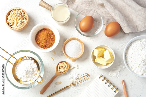 bake, flour, cake, cooking, sugar, sweet, food, pastry, dessert, egg, bakery, bread, ingredient, culinary, receipe, brown, bowl, kitchen, marble, table, background, cooked, top, view, flat, lay, gold, nut, almond, milk, healthy, utensil, homemade, white, spoon, egg, wooden, cookery, fresh, preparation, baking, ingredient