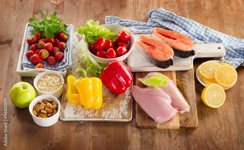 diet, healthy, balanced, balance, vegetable, nourishment, eating, meat, fruit, background, concept, meal, table, grain, fresh, eat, cooking, lifestyle, weight, organic, dairy, milk, product, natural, tomatoes, poultry, nobody, chicken, breast, fish, salmon