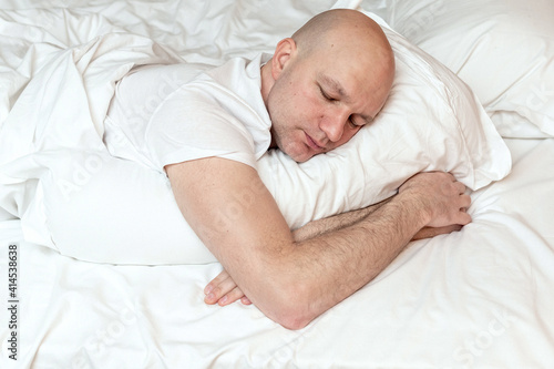 Bald man in his 40s in white shirt sleeps in his bed. Adult bedtime and rest concept