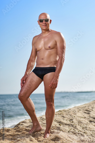 bald man on the beach by the sea on vacation
