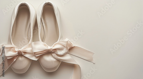 Ballet shoes with strips bow isolated on white graceful background with copy space, concept of hobbies and dancing and elegant lifestyle. Generative AI.