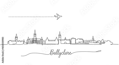 northern ireland, ireland, skyline, city, line art, minimal, minimalist, vector, illustration, aeroplane, travel, tour tourism, landmark, architecture, building, city landscape, town, urban, design, art, drawing, vignetting, outline, monochrome, black-and-white, single line, journey, flight, destination, adventure, vacation, europa, european, graphic, modern, simple, elegance, background, white space, isolated, silhouette, linear